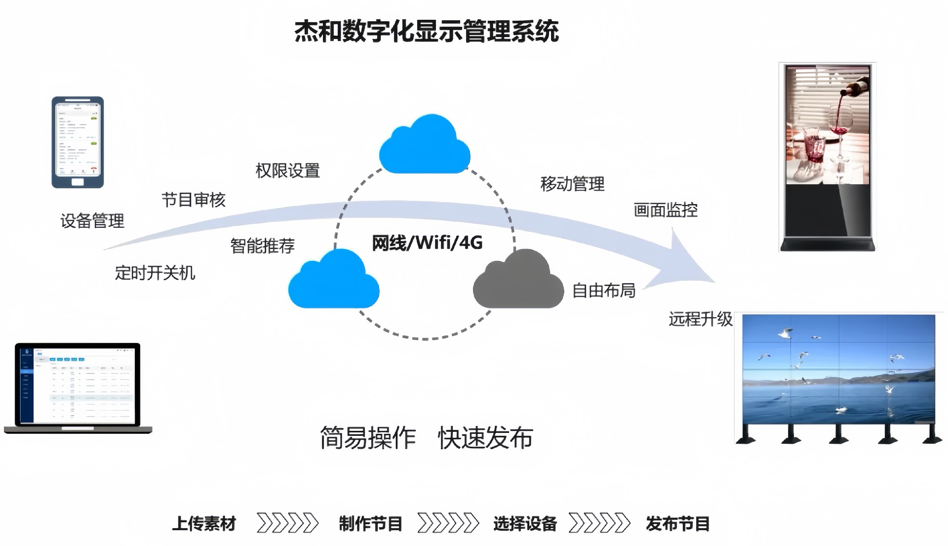 目前long8-龙8科技GDSM-ES系统覆盖市场上多形态网络智能显示终端,满足行业全产品业态需求,如广告机、LED显示屏、LCD拼接屏 、普通液晶电视等各种显示终端,广泛用于广告宣传、通知公告、指示引导。