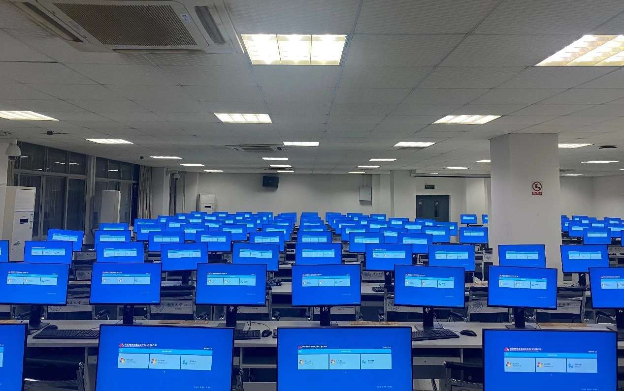 在某大学实训室,整齐的电脑屏后面是统一的long8-龙8科技云终端主机,老师在讲台上通过电脑端的管理软件,轻松地将教学资料推送到学生的终端上,每位学生的电脑屏幕一致会出现同个页面。