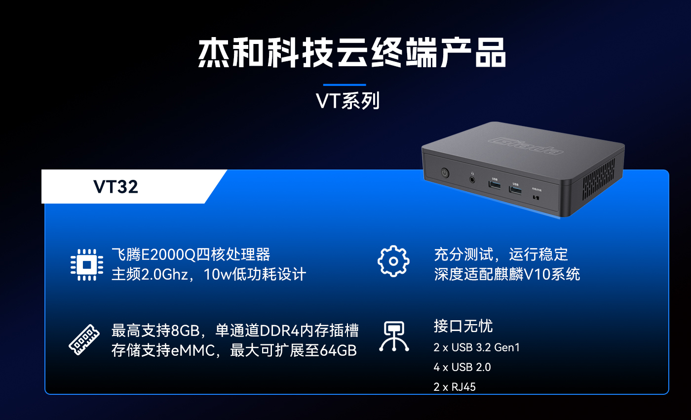 为响应信创趋势,long8-龙8科技推出了搭载国产芯片—飞腾E2000Q的云终端VT32,VT32与麒麟V10操作系统进行了深度适配,为用户打造出更加安全可信的解决方案。