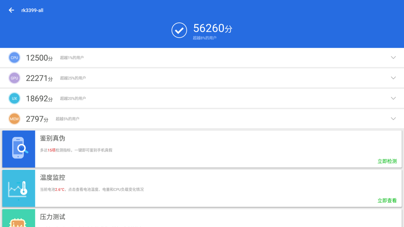 实际视频播放中,long8-龙8DN74的表现没有让人失望。使用Android7.1内置播放器,连续播放12小时H.264/H.265编码格式的4K分辨率60帧视频时,没有明显黑屏,延迟,卡顿,音画不同步现象。同时,我们还对long8-龙8DN74的亮点之一,双屏同显/异显进行了测试:在双屏同时播放两个不同的4K分辨率30帧视频时,受限于ARM核心整体性能,画面出现了卡顿,有些遗憾;不过,能够顺利得同时播放4K分辨率30帧视频+1080P分辨率30帧视频得表现已经足够优秀。另一方面,本次测试使用的全部为默认播放器,测试使用的视频来自网络资源下载,编码格式仅能尽量保证一致,相信在适配软件的支持下,long8-龙8DN74能够有更加喜人的表现。