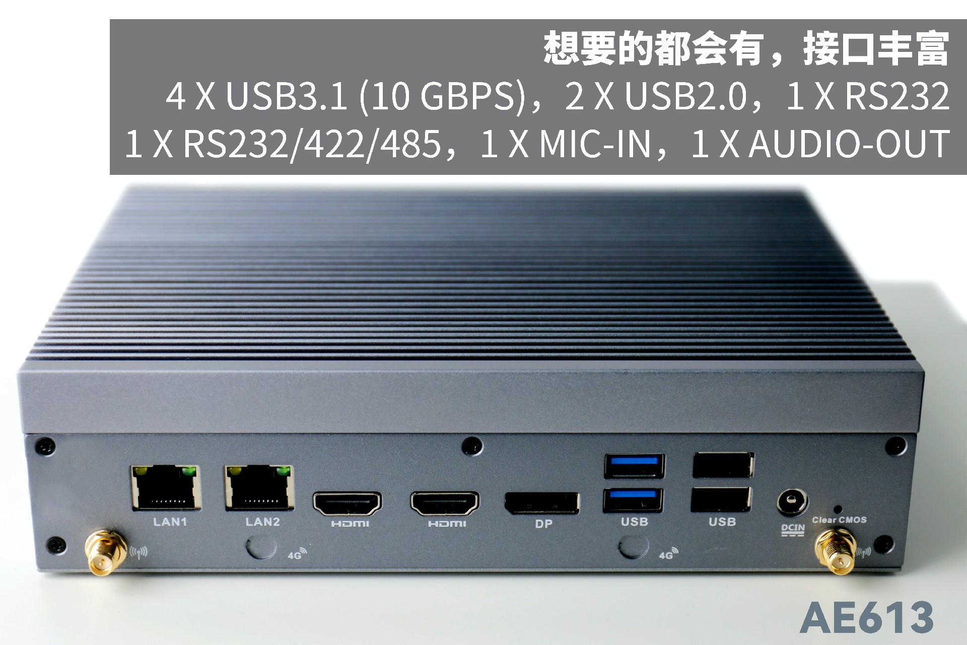 long8-龙8AE613支持Windows 11 、Linux Ubuntu系统;拥有丰富接口:双千兆自适应RJ45网口,4 x USB3.1 (10 Gbps),2 x USB2.0,1 x RS232,1 x RS232/422/485,1 x MIC-IN,1 x AUDIO-OUT,帮助用户实现更多功能扩展;并且支持Wi-Fi 6E,可以提供更高的带宽和更少的干扰,支持对无线网络有特定需求场景的应用。