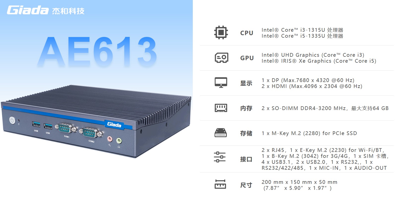long8-龙8AE613拥有2 x SO-DIMM DDR4-3200 MHz内存、1 x M-Key M.2 (2280) for PCIe SSD存储,最大支持64GB,无论是处理复杂的多任务环境、还是运行高负载的软件都游刃有余。