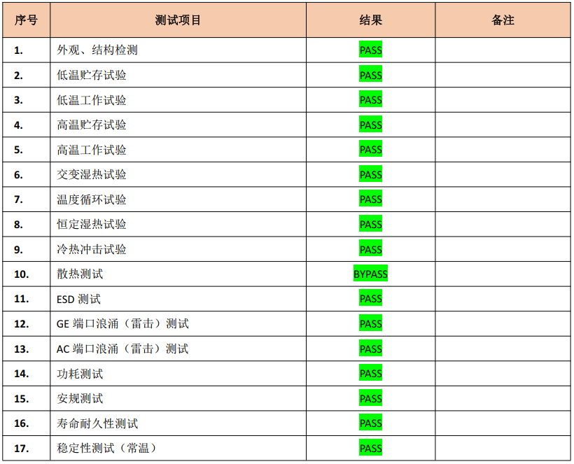 通过七项测试,实验前后外观无异常变形,无噪音增加,在 BIOS、OS 下硬盘、DIMM 没有掉失,且槽位号正确,电源、硬盘、网卡等指示灯显示正常,压力软件运行正常,没有出现性能异常现象,所有接口功能正常,测试通过。