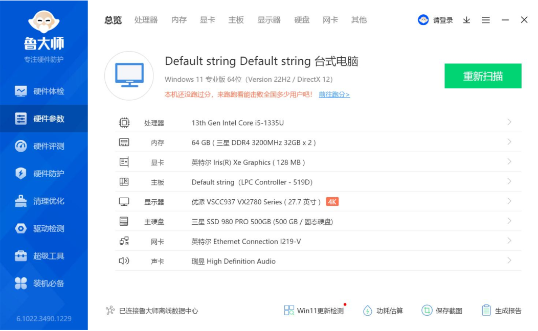 上面是鲁大师识别的long8-龙8AE613硬件参数详情,我们进行跑分测试的核心三大件选择的是13th Gen Intel(R) Core(TM) i5-1335U @1.30GHz处理器,Intel(R) Iris(R) Xe Graphics显卡,三星 32GB*2 DDR4 3200MHz内存,三星SSD 980 PRO 500GB(500 GB/固志硬盘),下面我们来看详细的跑分数据。
