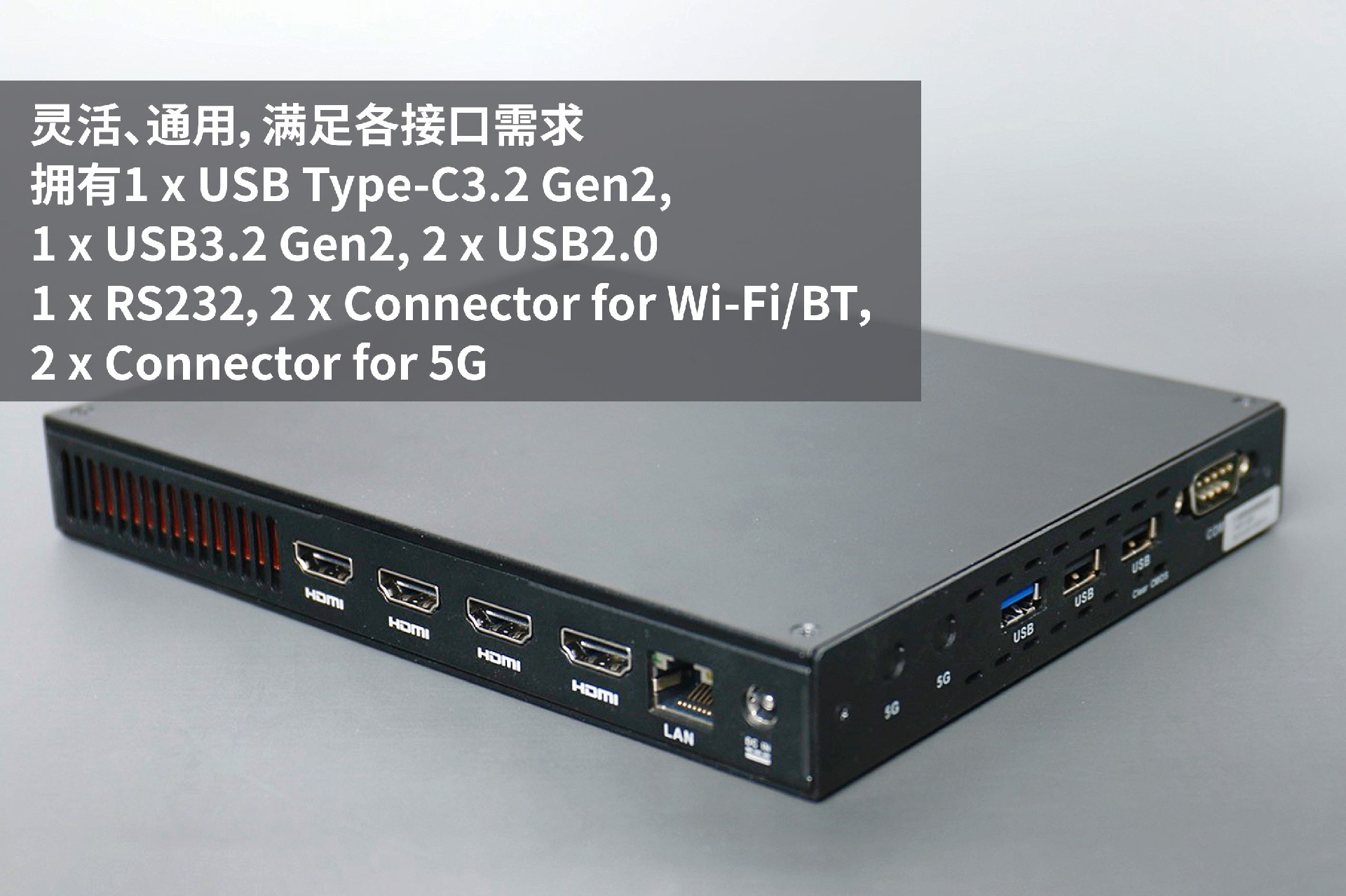 支持4 x HDMI 2.0接口,提供多达4屏4K显示(4096 x 2304@60Hz);支持1 x RJ45千兆网口,1 x E-Key M.2 (2230) for Wi-Fi/BT, 支持Wi-Fi 5, Wi-Fi 6, Wi-Fi 6E (CNVi),具备强大的网络通信能力。支持1 x USB Type-C3.1,1 x USB3.1 2 x USB2.0,1 x RS232,1 x二合一音频接口,拓展能力丰富,可以连接会议大屏、摄像头、麦克风、音响、U盘、扩展坞、无线投屏等设备。
