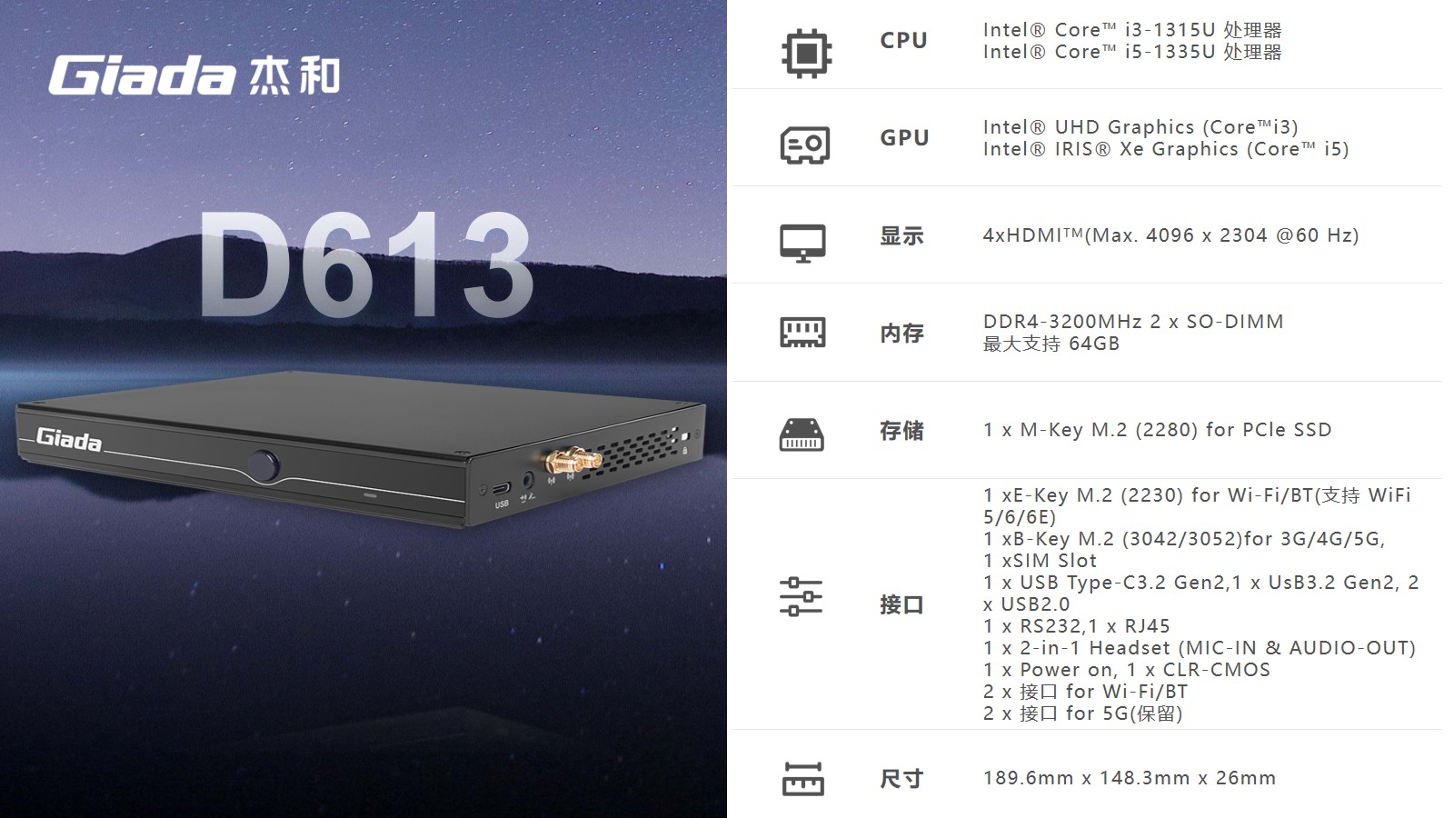 long8-龙8科技D613可选配Intel®第13代AlderLake i5-1335处理器,作为家用迷你主机来说,足够大的内存容量也可以提升迷你主机的性能表现,更好地支持多任务处理,大型应用程序的运行以及高清视频编辑等任务,拥有的2个SO-DIMM插槽,内存DDR4最大支持64GB的内存容量可以减少系统对硬盘的依赖,提高系统的响应速度。