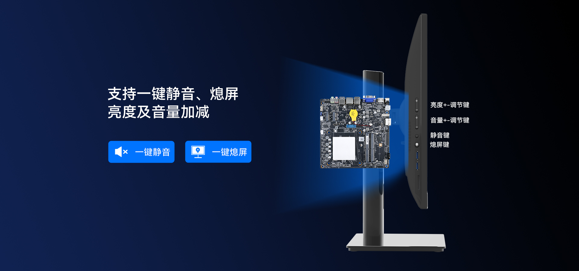 支持硬件一键静音、一键熄屏、音量加减、亮度加减